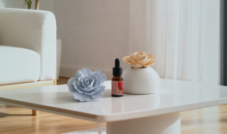 Add essential oils to a flower diffuser or insert aroma reeds into a bottle containing essential oils. The scent will be diffused into air gradually. This method is easy to use and safely adds fragrance to the surroundings.